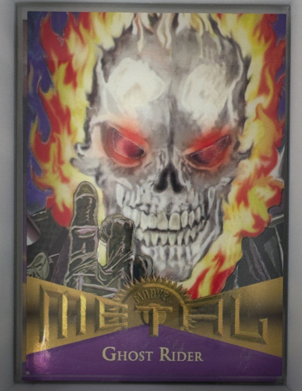 Ghost Rider Midnight Sons trading card from the 1995 Marvel Metal series, featuring artwork by Tom Kyffin. This is card No. 59 from the Lehigh Colortronics collection, showcasing the iconic anti-hero in stunning metallic detail. A must-have for Marvel collectors and Ghost Rider enthusiasts seeking vintage 1990s memorabilia. Condition and authenticity vary; inspect photos carefully before purchase.