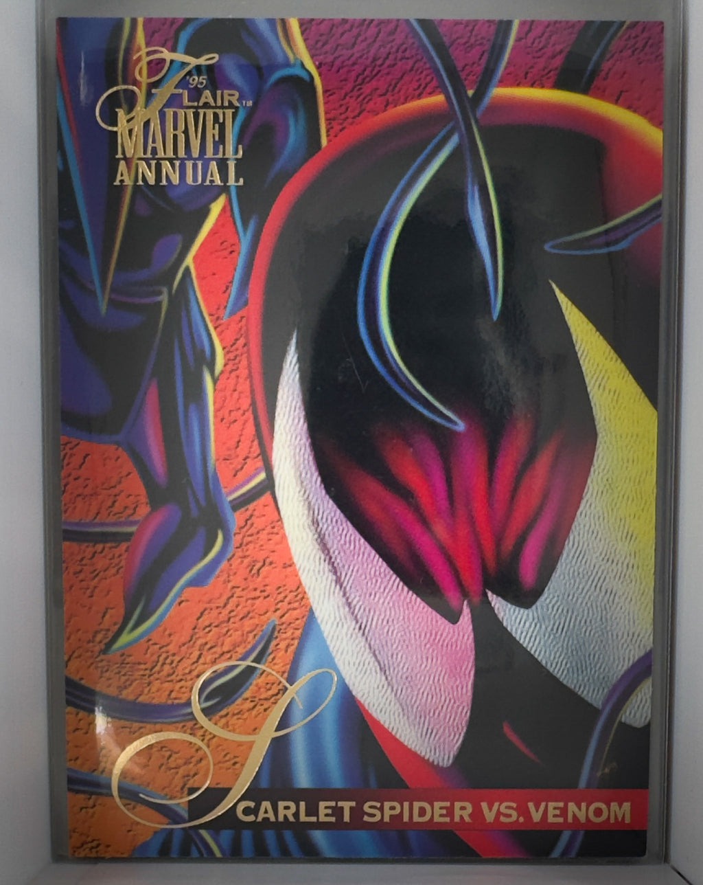 This 1995 Marvel Annual Flair trading card captures an iconic confrontation between Scarlet Spider and Venom in the "Baptism of Fire" storyline. Card No. 65 features dynamic artwork showcasing the intense clash between these two formidable characters. A must-have for collectors of 1990s Marvel cards and fans of Spider-Man lore. The Flair series is renowned for its premium card stock and vibrant color reproduction, making this piece a visually striking addition to any collection. Condition and rarity make vintage Marvel cards like this increasingly sought-after investments for serious enthusiasts.