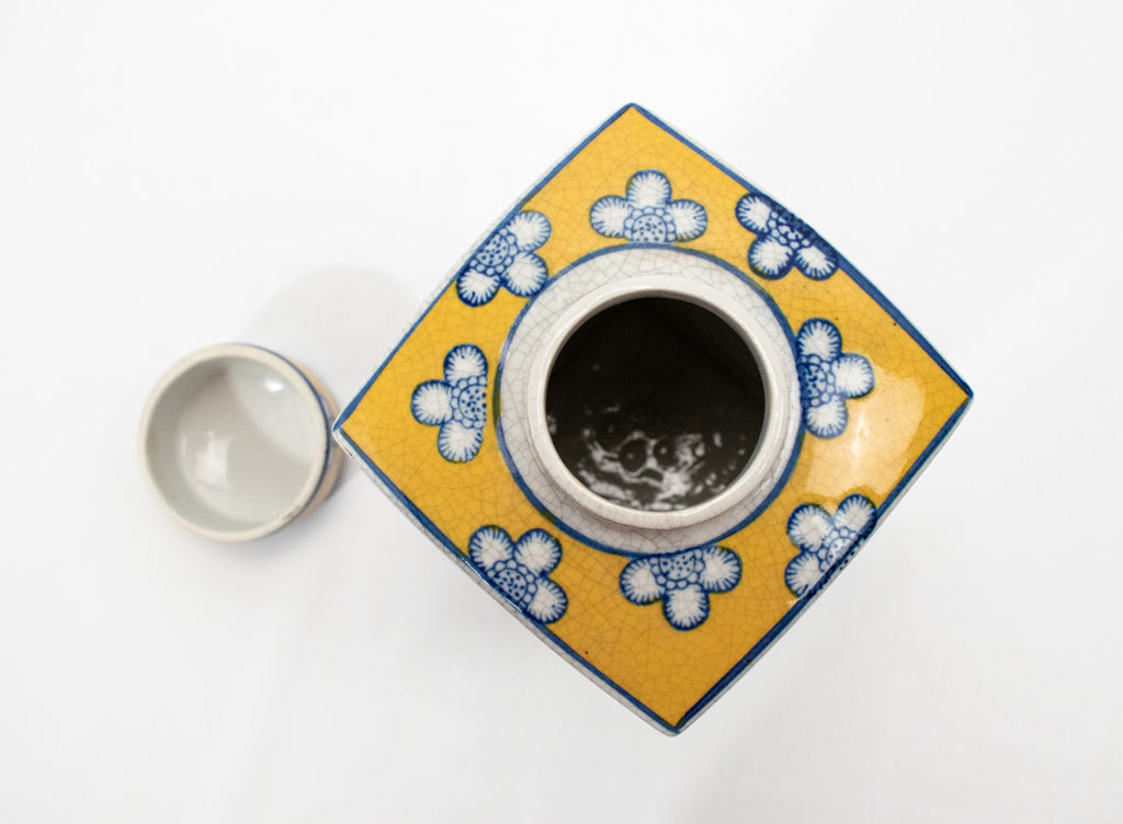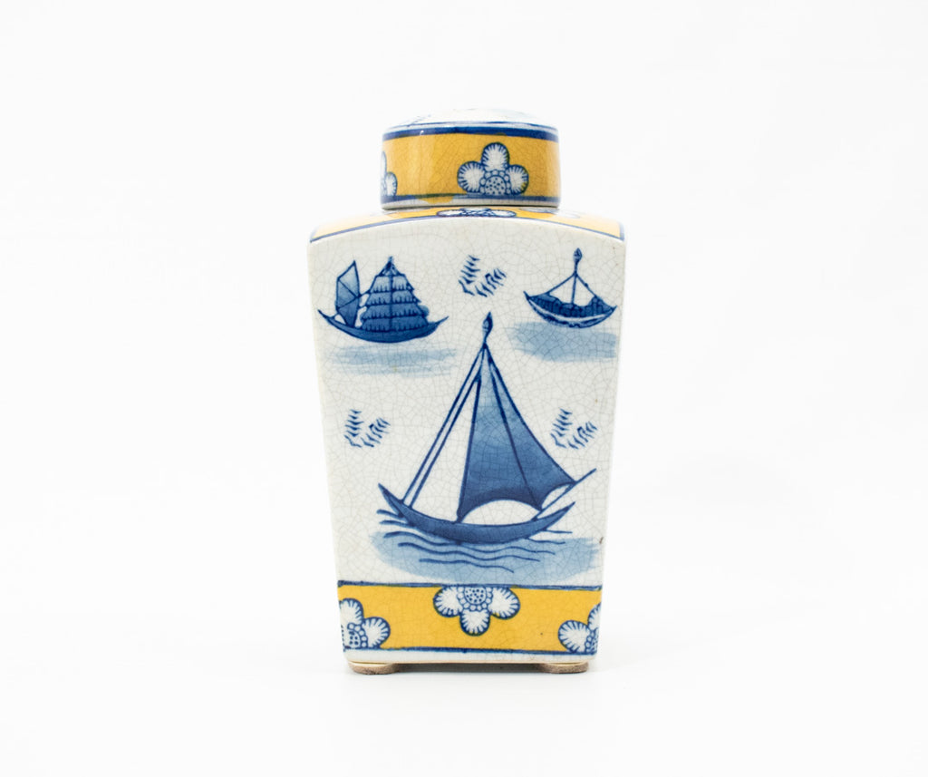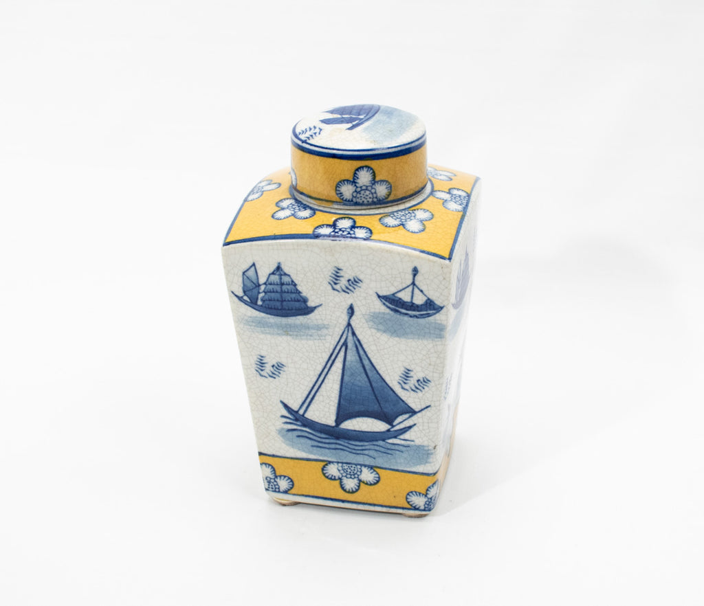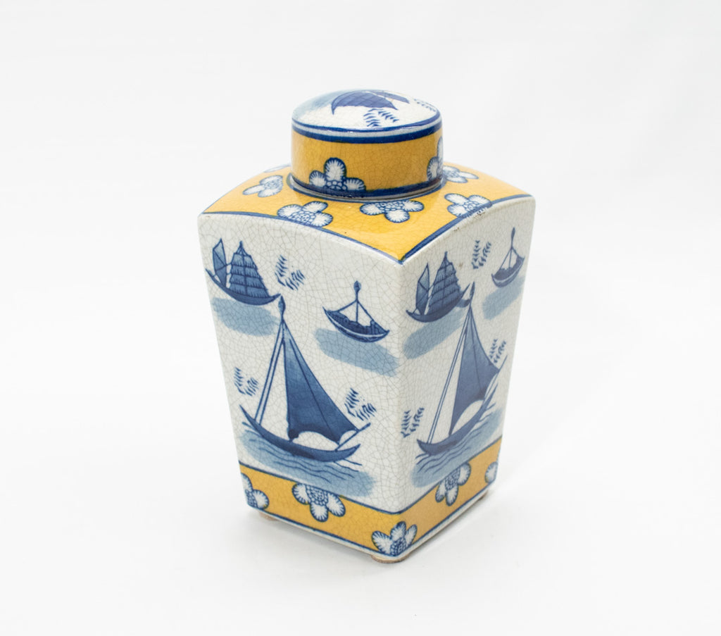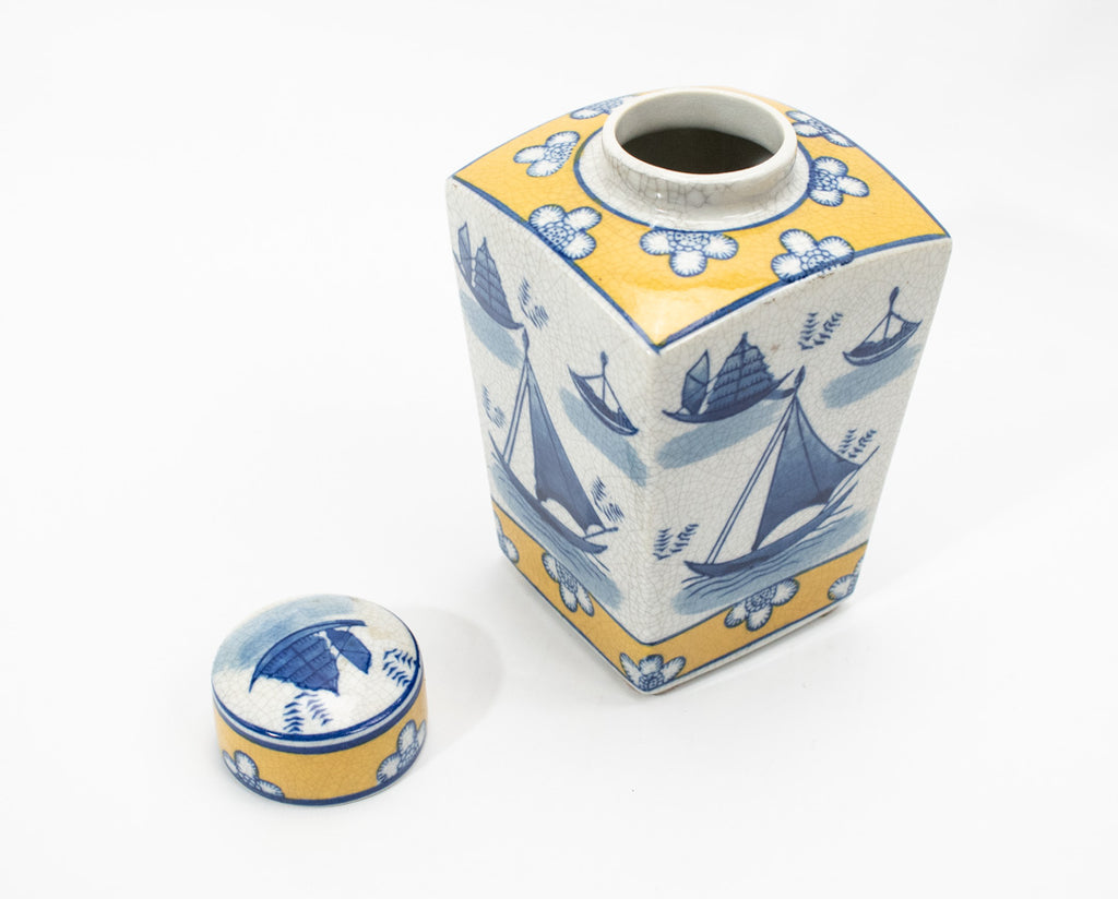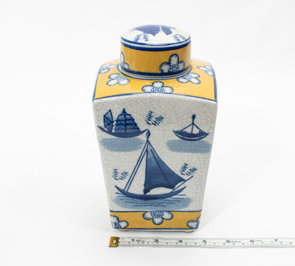 Asian Ceramic Jar Container Blue Yellow Sailboat China Home Decorative Used