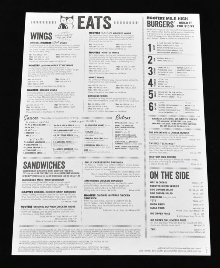 Hooters 2020 Covid Menu Authentic Print Used Non Framed