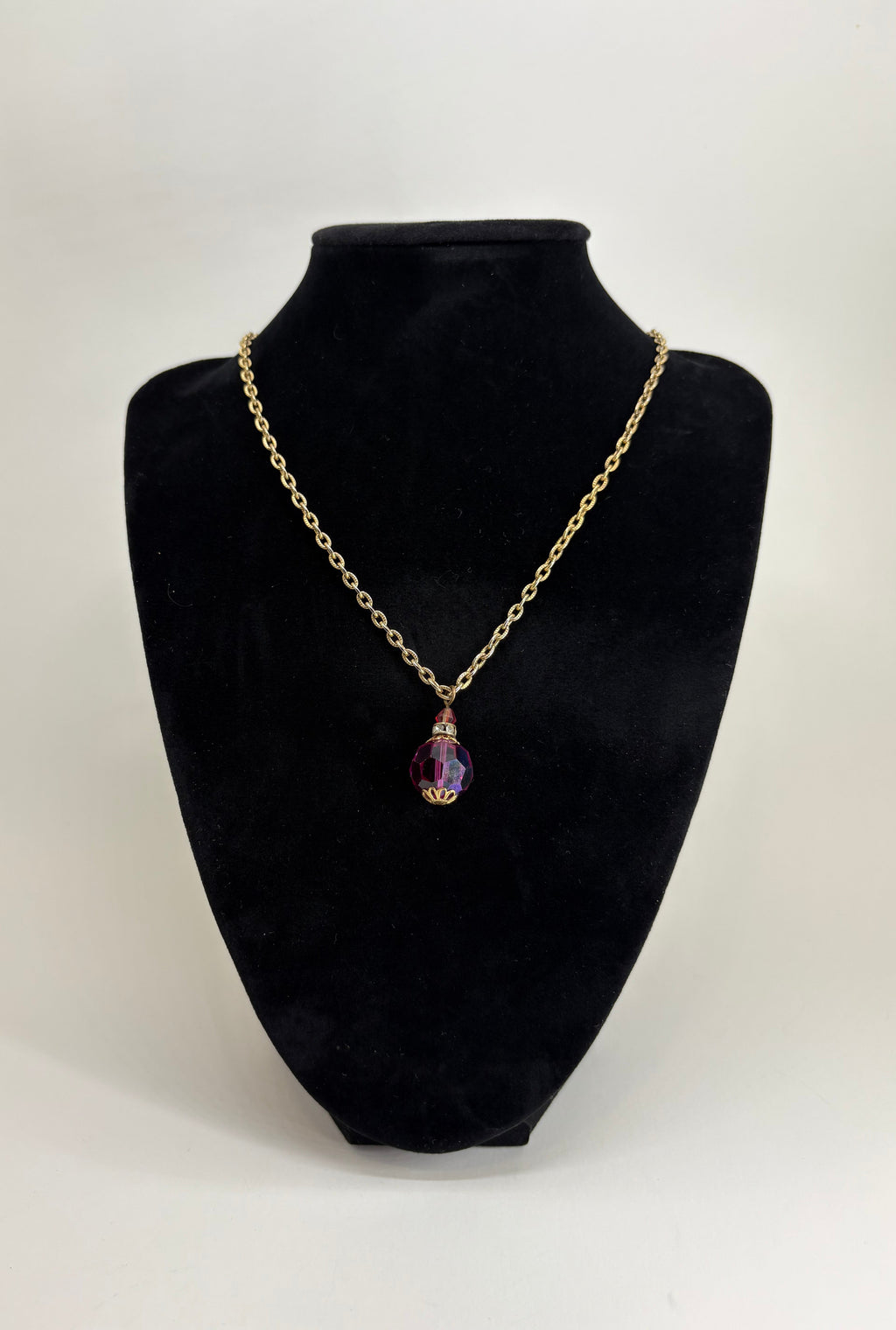 Add a delicate touch of vintage elegance with this 13.5-inch gold tone necklace, featuring a single pink glass bead pendant. The soft blush hue of the pendant contrasts beautifully with the warm gold-tone chain, creating a timeless accessory that exudes feminine charm and retro sophistication.