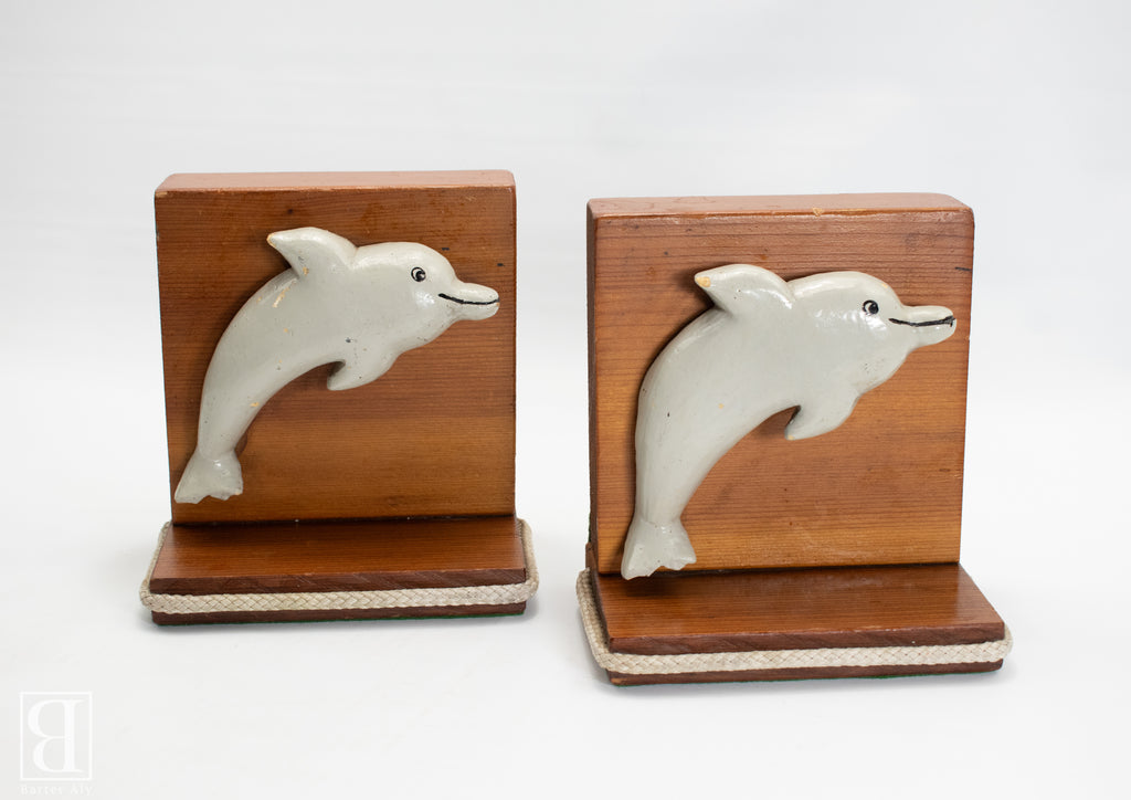 Vintage Bookend Book Holders Dolphins Wood Unique Made Collectible Set used Book Ends